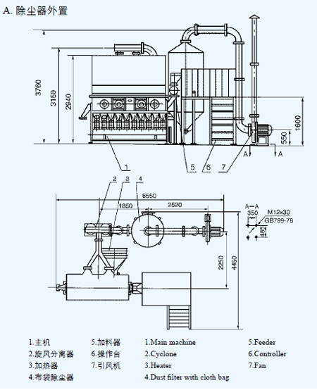 沸騰干燥器是利用經(jīng)過濾后的潔凈空氣,經(jīng)熱交換器的對流換熱,使空氣溫度上升到一定值進(jìn)入主機(jī)分風(fēng)筒,經(jīng)閥片分配進(jìn)入沸騰器,濕物料從加料器進(jìn)入干燥器。由于風(fēng)壓作用,物料在干燥器內(nèi)形成沸騰狀態(tài),使熱空氣與物料進(jìn)行充分接觸,增強(qiáng)了傳熱傳質(zhì)過程,在較短的時(shí)間內(nèi)促使物料中的水份蒸發(fā)分離。物料干燥后由排料口排出,廢氣由沸騰床頂部排出,經(jīng)旋風(fēng)除塵器和布袋除塵器回收固體粉料后排空。本設(shè)備一般進(jìn)行負(fù)壓操作。
